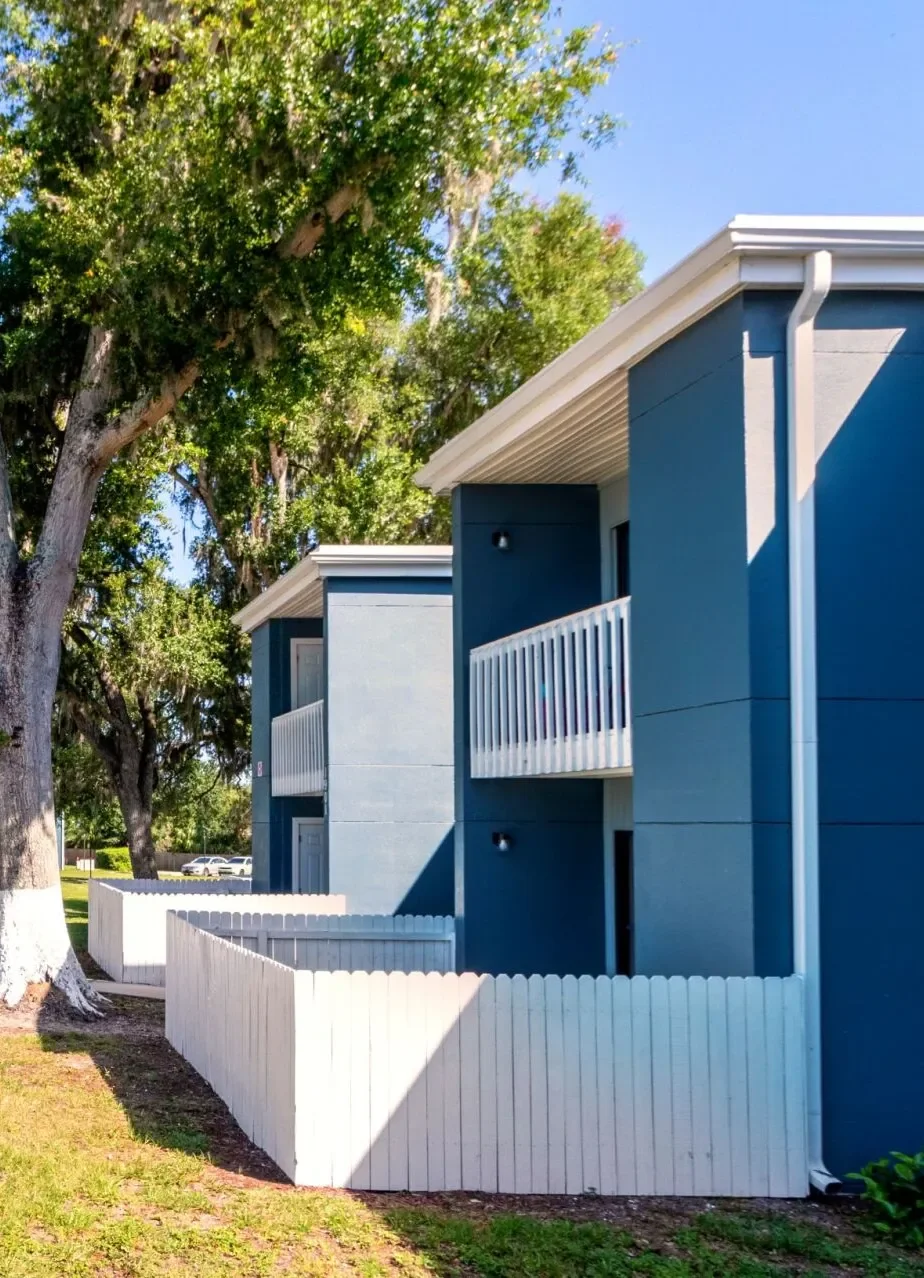A blue two-story apartment building with white balconies, white fencing, and surrounded by trees on a sunny day.