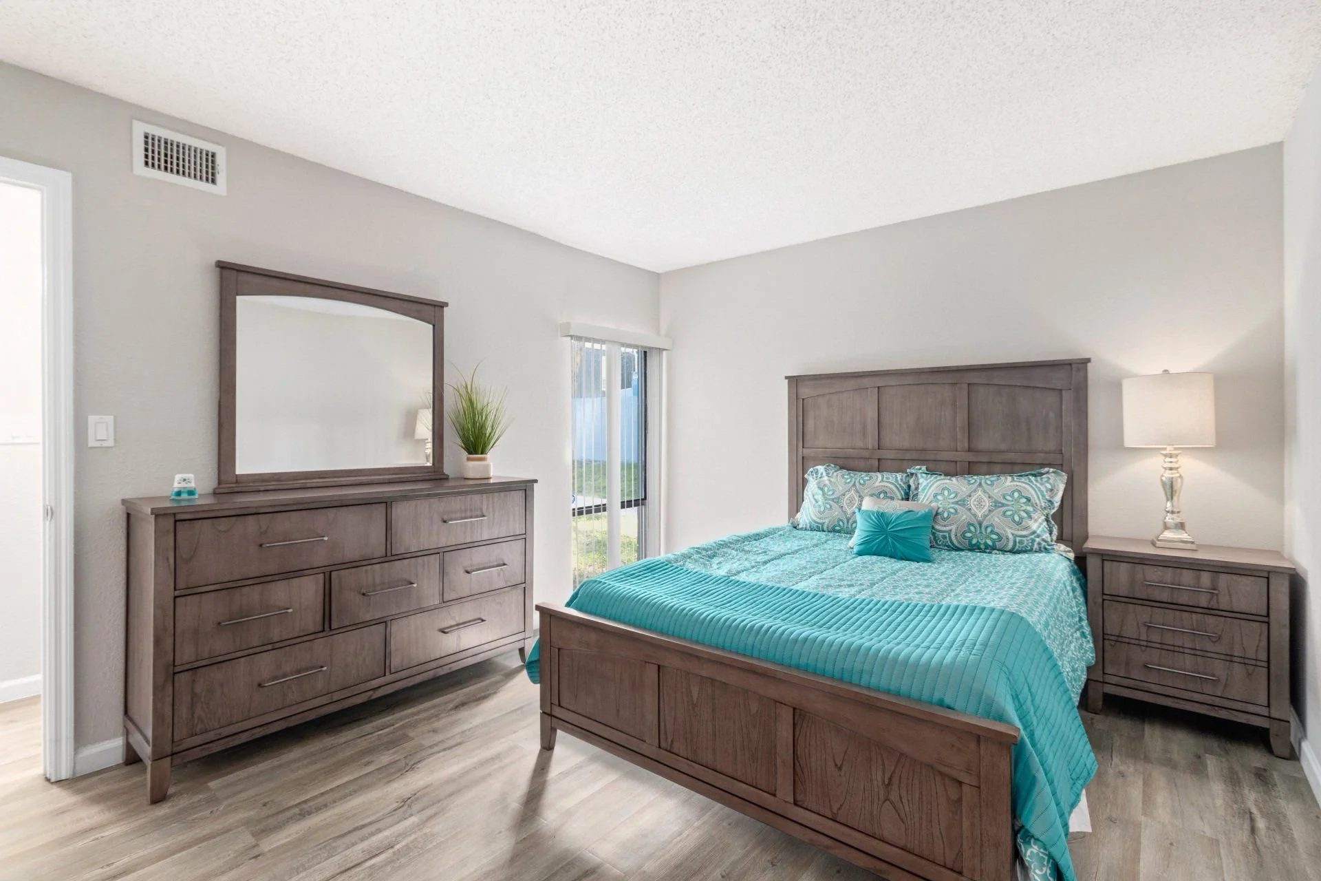 A bedroom with a wooden bed, a dresser with a mirror, a nightstand with a lamp, and a sliding glass door leading to a backyard.