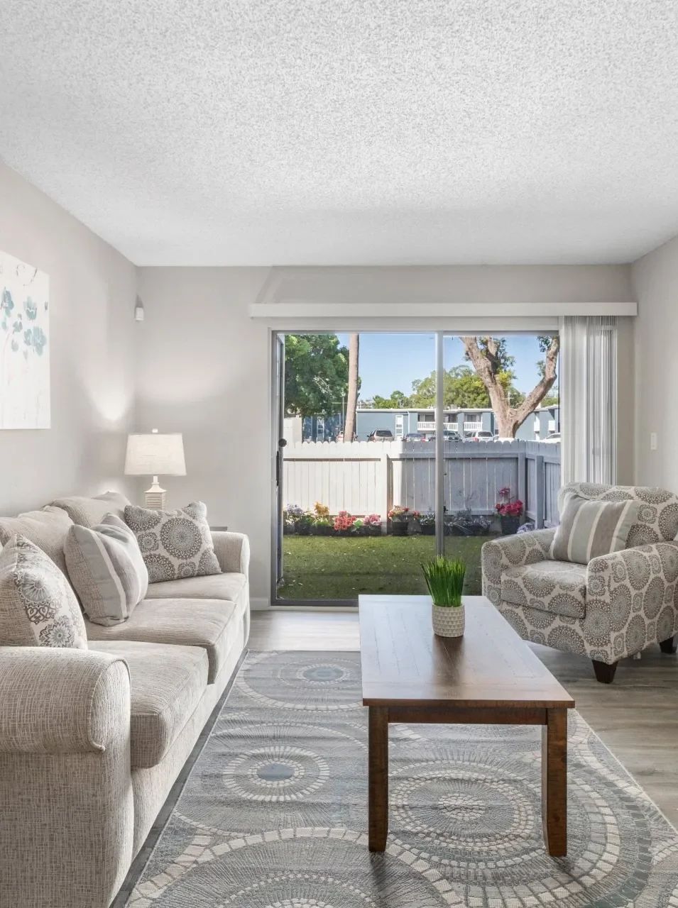 Living room with beige sofa and patterned armchair, wooden coffee table, sliding glass door leading to backyard with grass, flowers, and trees.