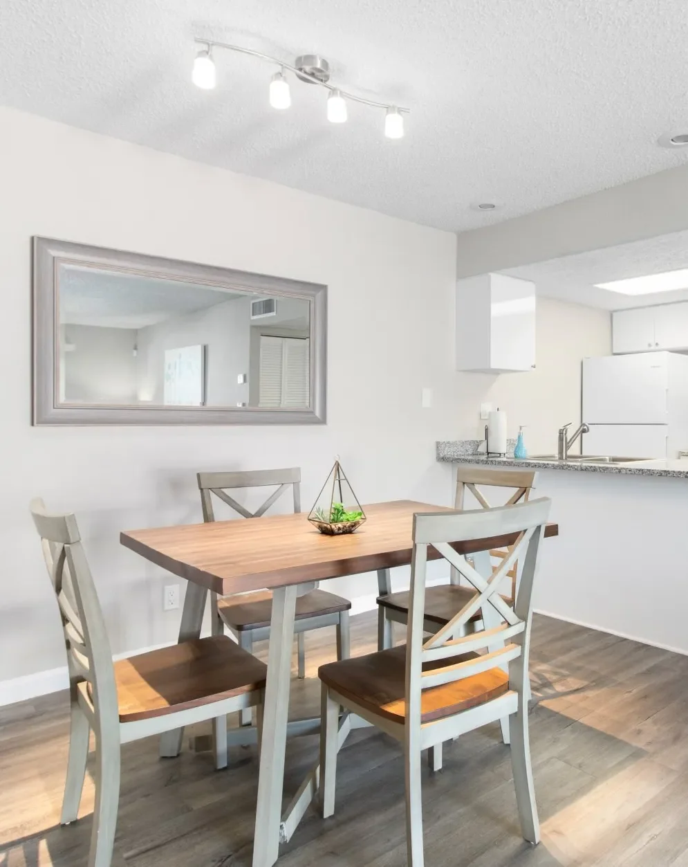 Dining area with wooden table and four chairs, wall mirror, and kitchen in background with white appliances and granite countertop.