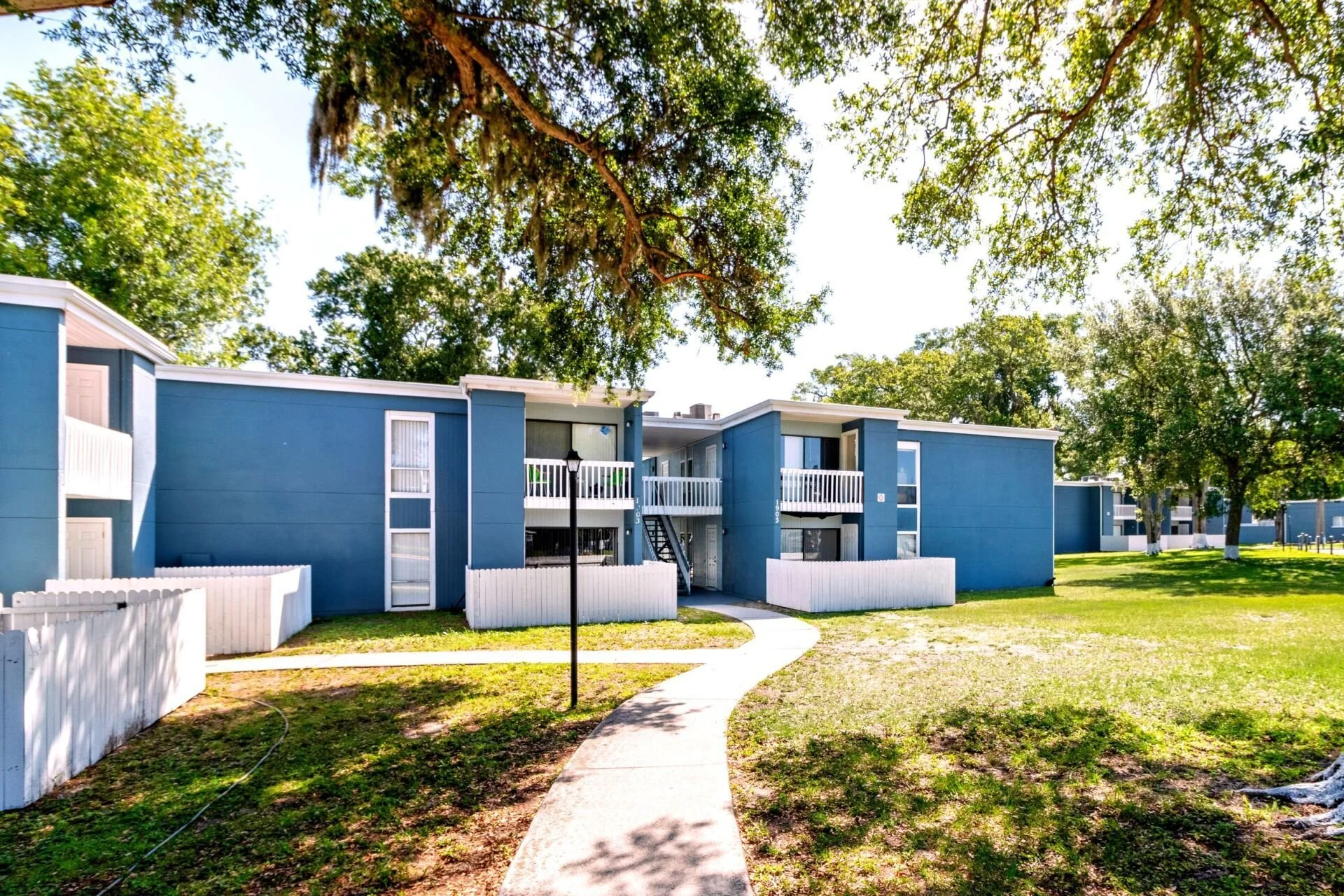 Two-story blue apartment building with a white fence and a curved walkway, surrounded by green trees and grass.