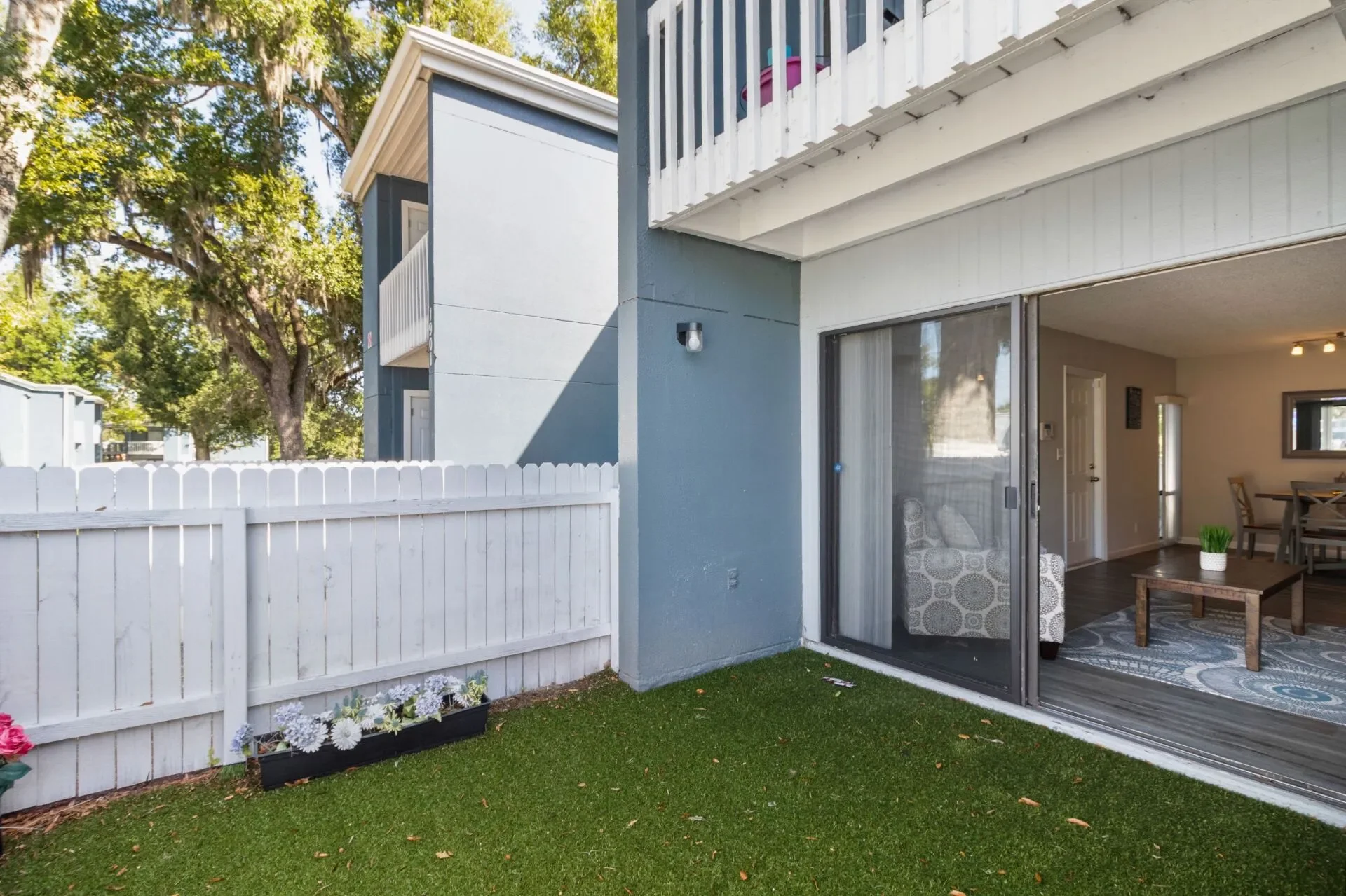 View of a backyard patio with artificial grass, white picket fence, and a sliding glass door leading into a living room with dining table.