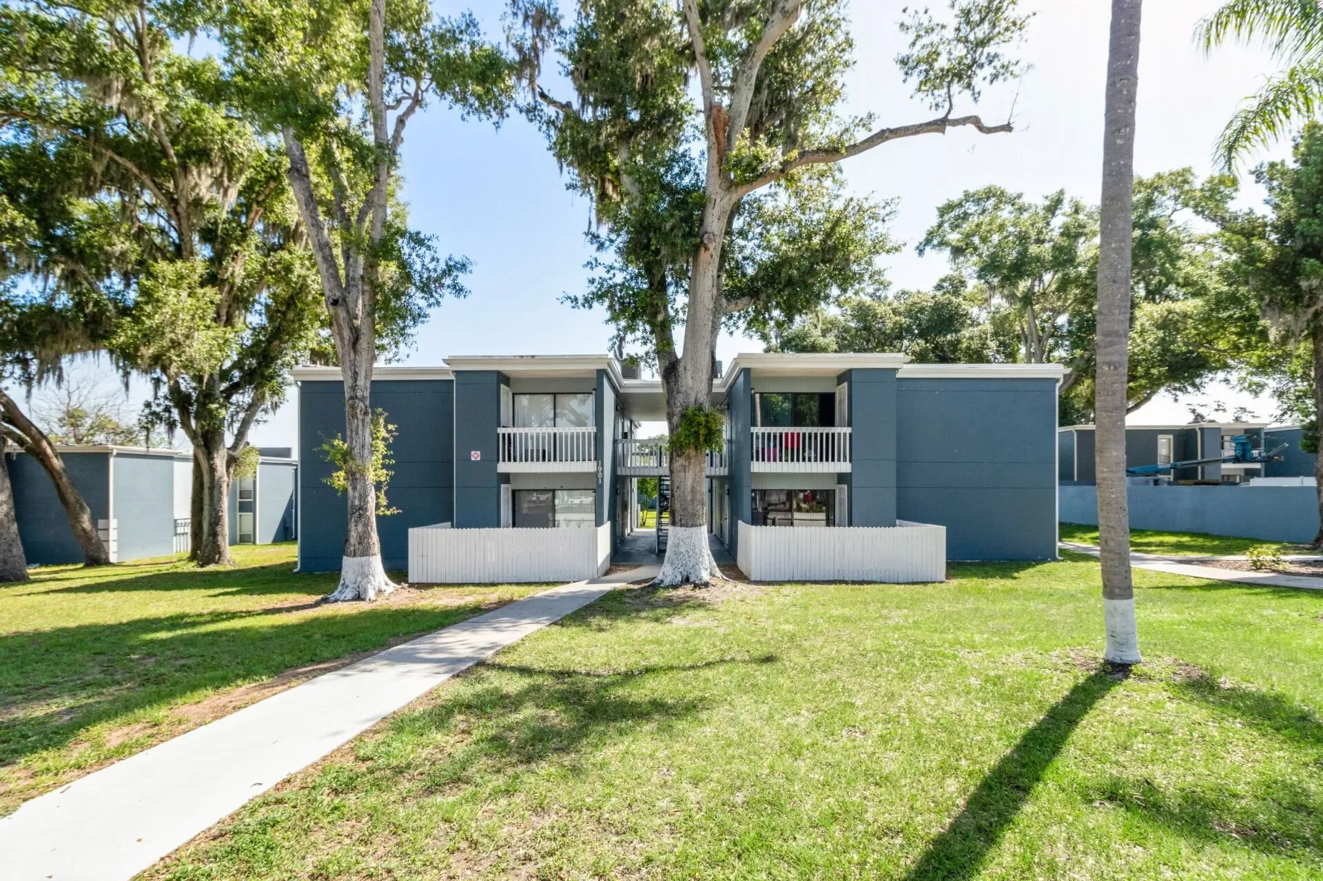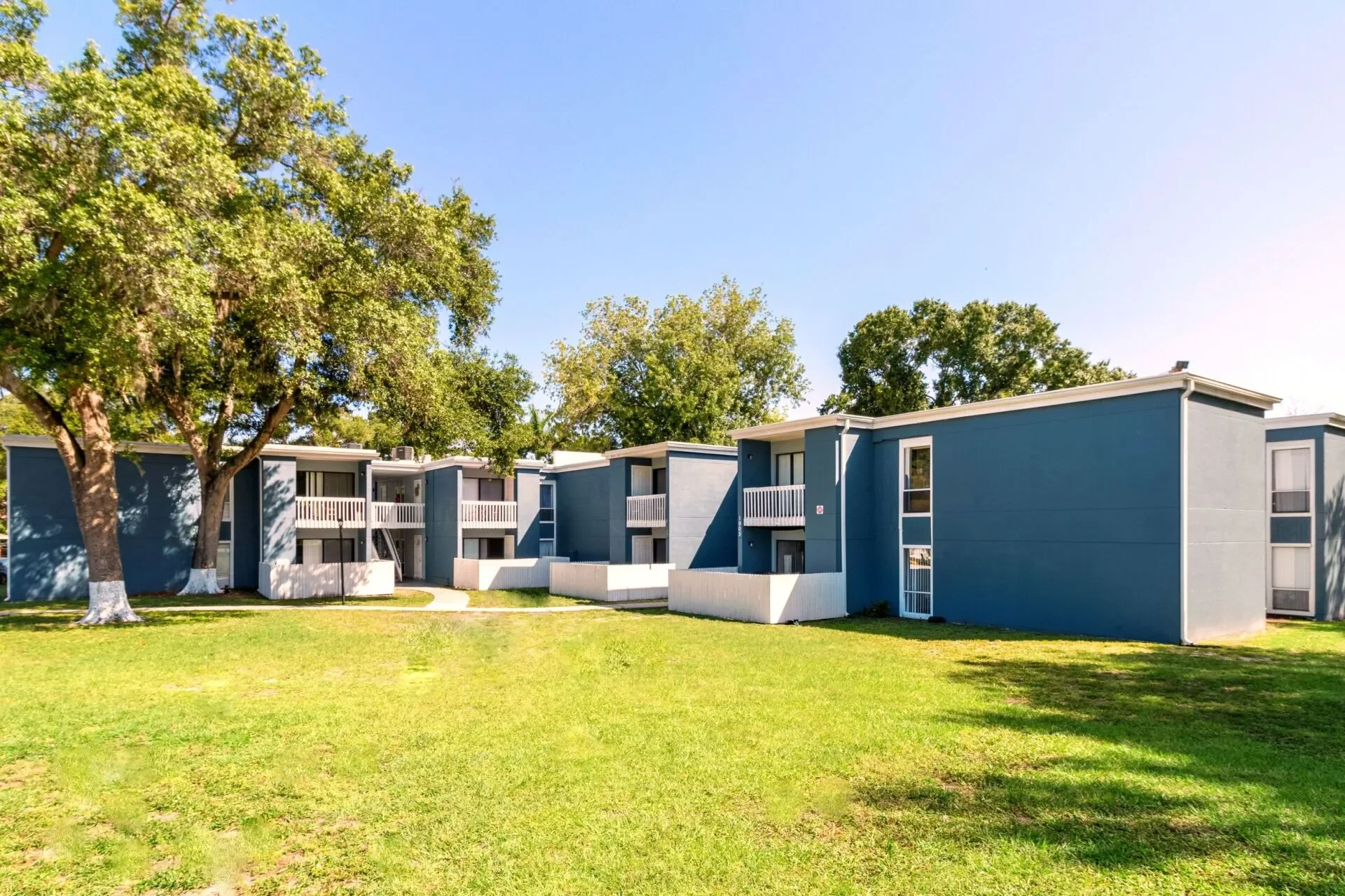 Modern two-story apartment building with blue exterior, surrounded by green grass and tall trees, with a walkway leading to the entrance.