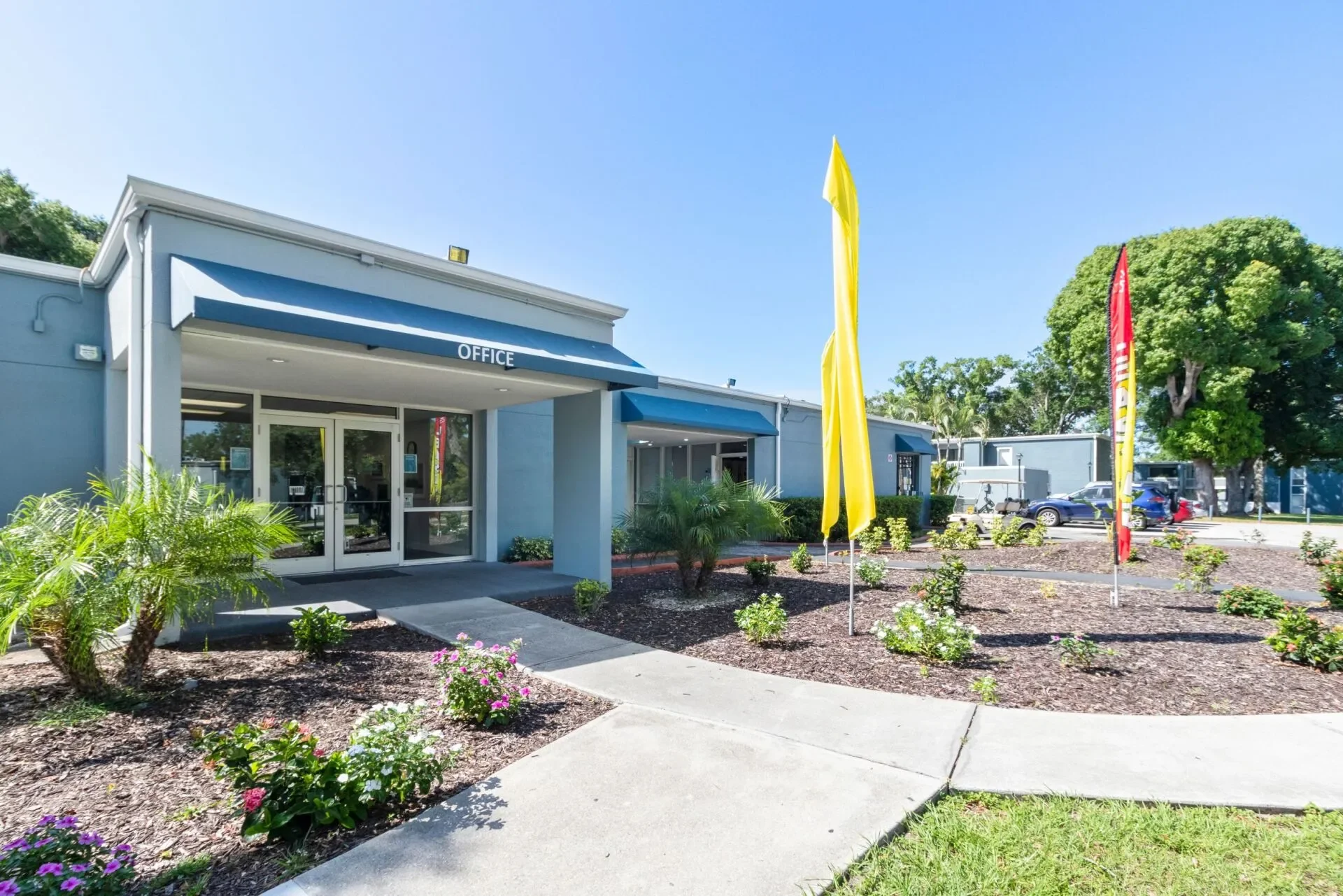 Exterior view of a light gray office building with a sign above the entrance reading 'OFFICE', surrounded by a landscaped garden with small bushes and flowers, yellow and red flags, a parking lot with cars, and a large green tree under a clear blue s